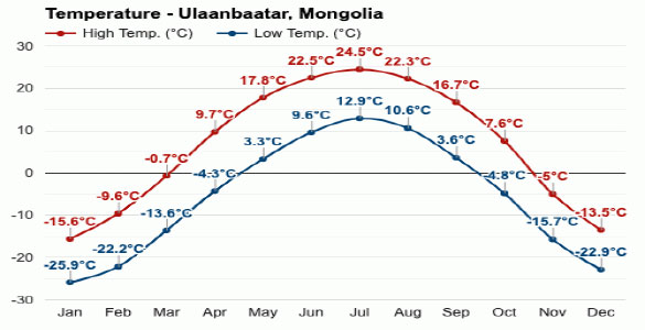 Mongolia, a landlocked country, is located far from the seas and oceans so it has a harsh continental climate with very little rainfall, long, cold winters and short summers. Generally, average temperatures are around 0.2°C (32°F), winter temperatures are -10° …-30°C (14° …22°F) and summer temperatures are 10° …27°C (50° …80°F). Several occasions, temperatures can falls to as low as -50 degree Celsius in January, the coldest month whereas summer’s temperatures can rise to 30 degree Celsius in July, the hottest month. The annual average precipitation is 200 to 220 mm. Mongolia is the land of winds and especially sharp winds blow in spring, April and May. Mongolia is called “The land of the blue sky” as there are about 250 sunny days a year.